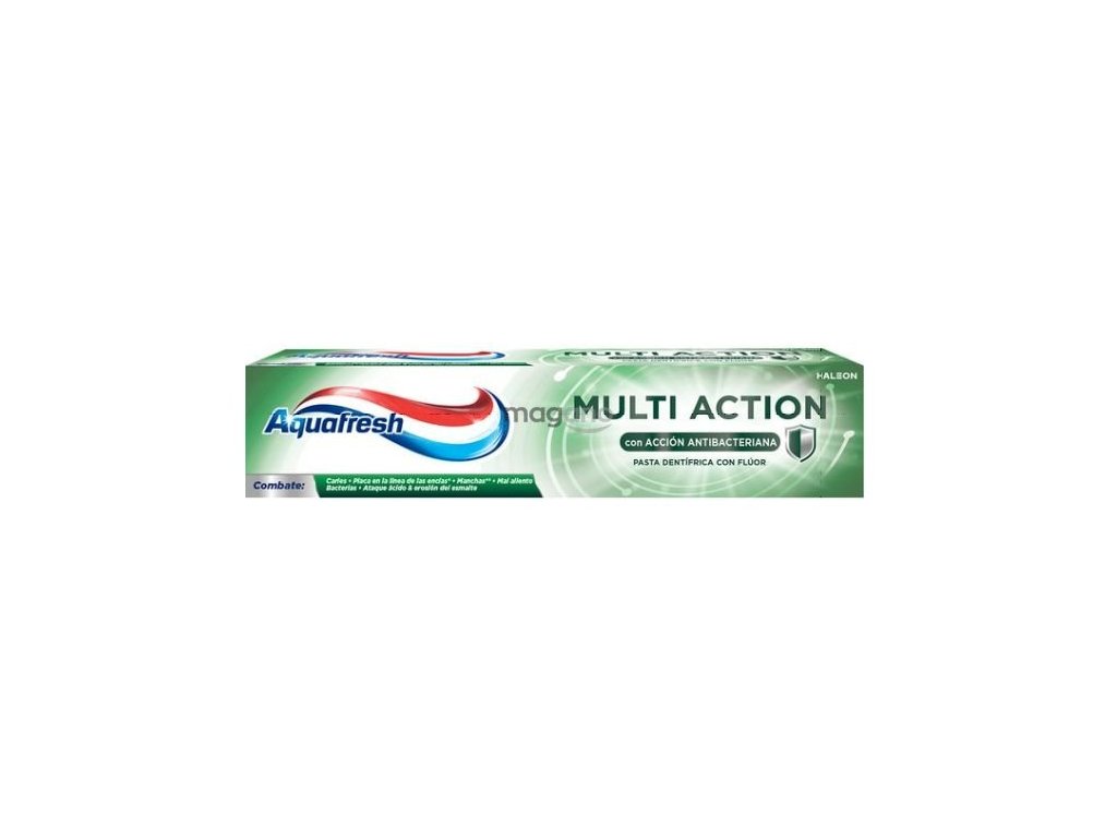 Aquafresh Multi Action je zubná pasta, ktorá poskytuje sedemsmernú ochranu ústnej dutiny a stará sa o zdravie zubov, ďasien a svieži dych každý deň. Vďaka inovatívnemu zloženiu a trojitému pásiku (biely, červený a modrý) pasta účinne odstraňuje zubný povlak, posilňuje sklovinu a chráni pred zubným kazom a zároveň ponúka dlhodobý pocit čistoty a sviežosti.
