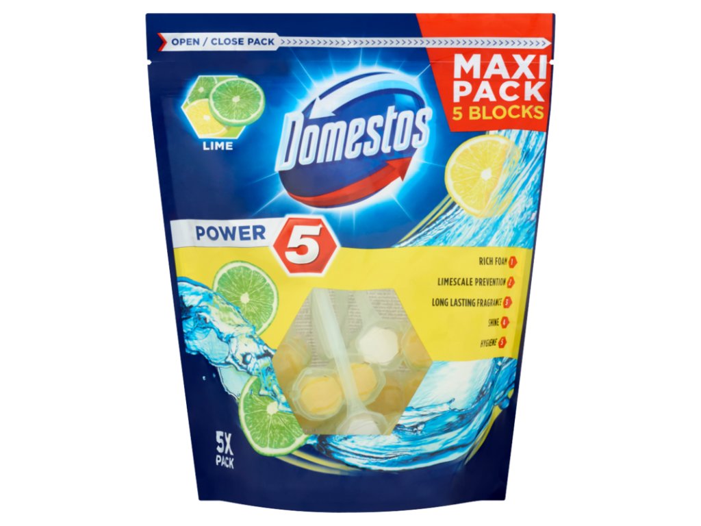 Domestos Power 5 tuhý WC blok pre intenzívnu starostlivosť pri každom spláchnutí.