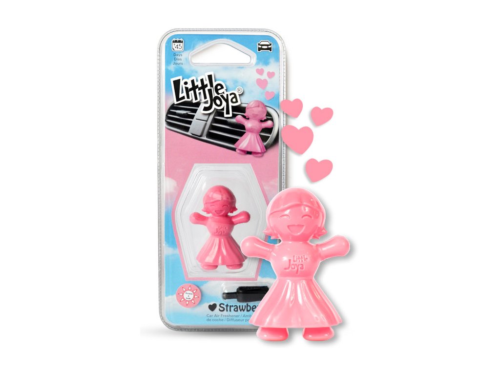 Štýlový osviežovač vzduchu do auta v podobe veselého usmiateho panáčika - dievčatka. Vkladá sa do mriežky ventilátora pomocou úchytky. Vyrobené z plastu. Vôňa: Strawberry.