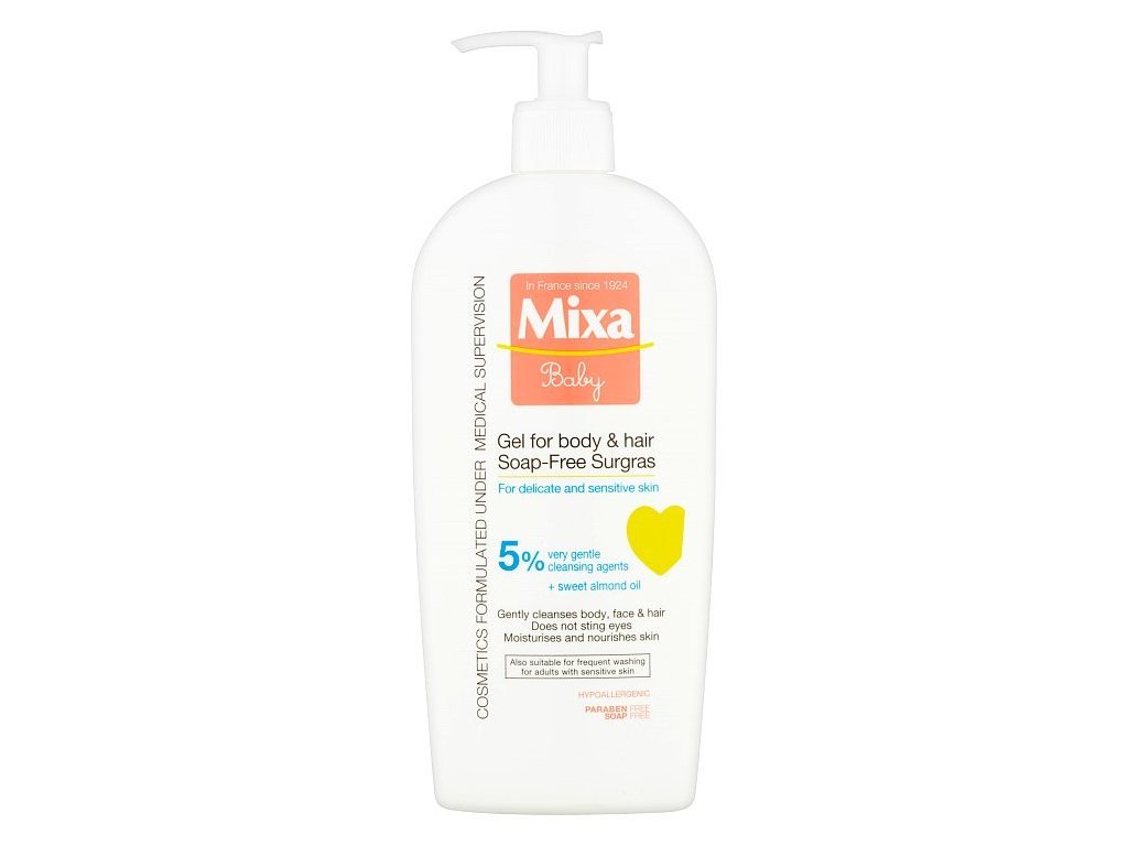 Mixa Baby je určená pre potreby detskej pokožky a vlasov, ktoré sú citlivejšie na negatívne vonkajšie vplyvy a každodenné nepríjemnosti. Veľmi jemné zloženie bez mydla šetrne čistí telo aj vlásky Vášho dieťatka. Obohatené o mandľový olej, hydratuje a vyživuje pokožku. Pokožka je vláčna, vlásky sú rozmotané, hebké a žiariace zdravím.