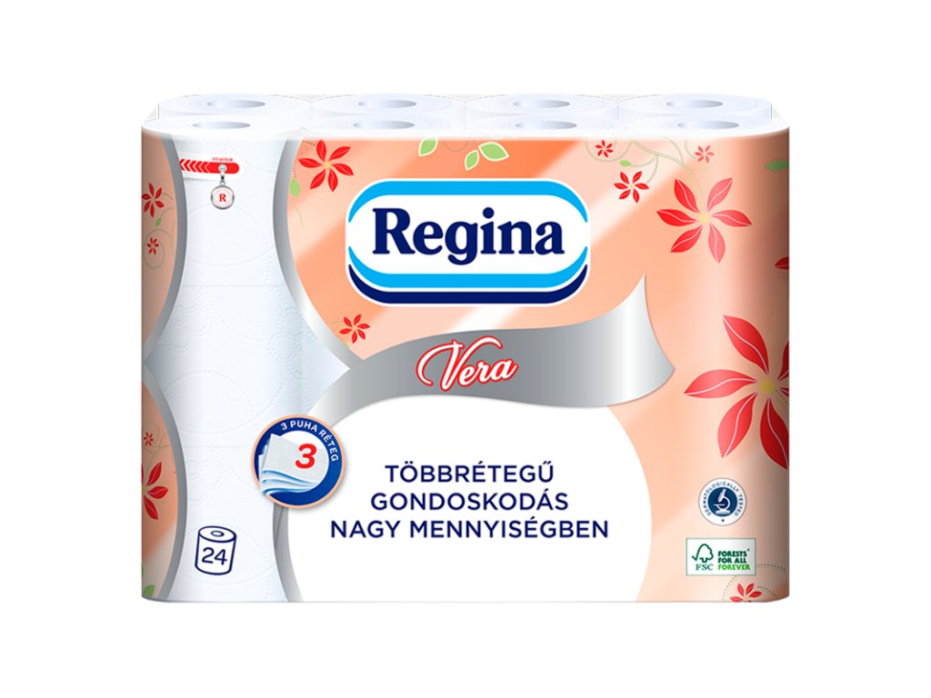 Regina - VERA toaletný papier je novinka na trhu je vyrobený celulózy, má žiarivo bielu farbu v 3-vrstvovom prevedení. Jedna rolka obsahuje 120 útržkov, a v jednom balení nájdete až 32 kusov.