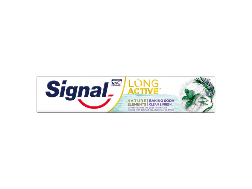 SIGNAL Long Active Nature Elements obohatený jedlú sódou, rozmarínom a mätou. Jeho zloženie poskytuje hĺbkové čistenie a zvyšuje prirodzenú sviežosť dychu. Pre čistý, svieži a prirodzený úsmev. Toto jemné zloženie mieša prírodné oleje s minerálmi zinku a má účinnú antibakteriálnu silu. Výsledkom je kompletná ochrana obohatená prírodou.